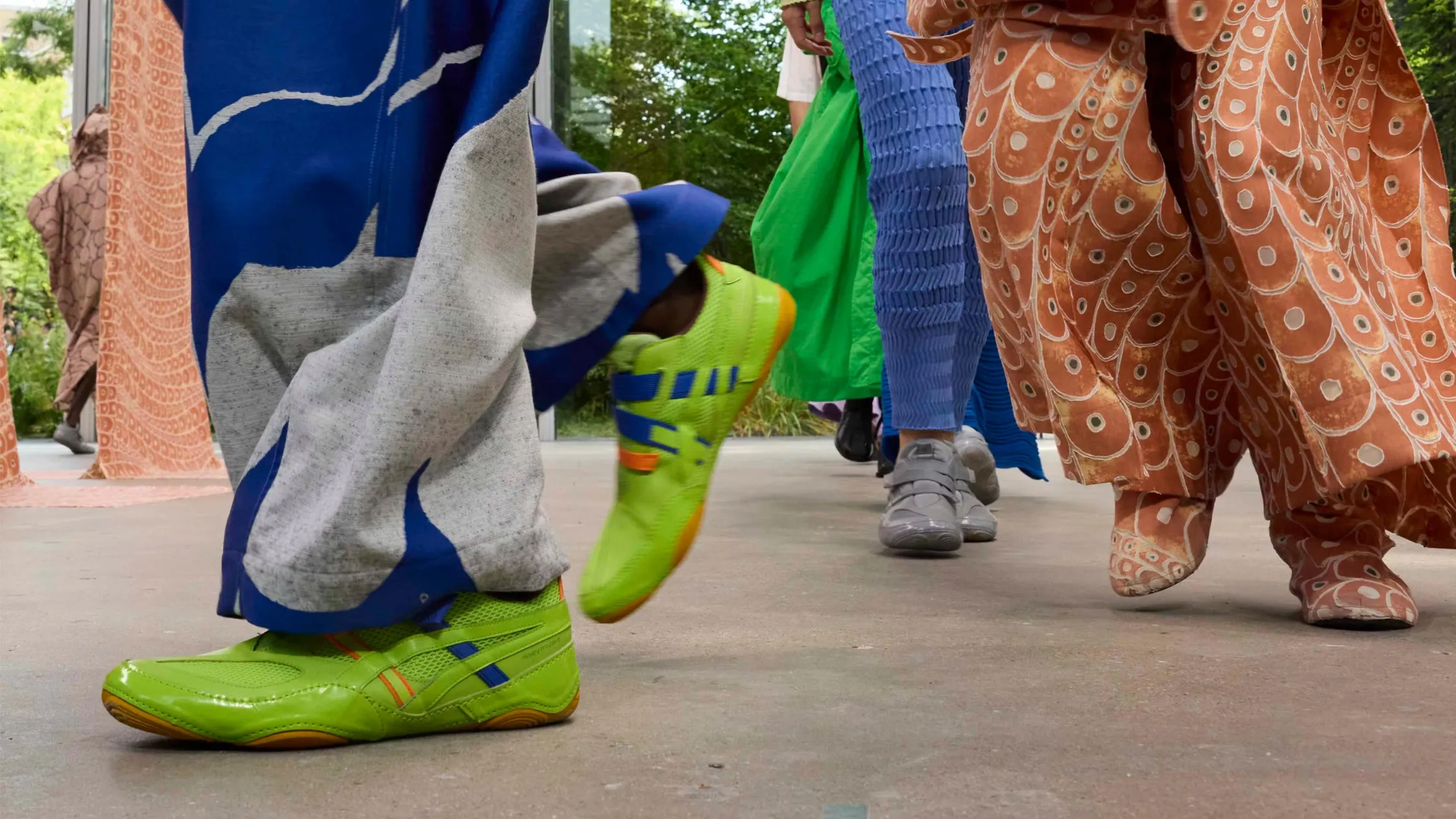 This season’s collection drew inspiration from the work of 20th-century Japanese ceramicist Shoji Kamoda, resulting in architectural silhouettes infused with a curious, organic futurism and an explosion of color. And under all that clay-inspired fashion? A wild surprise: specially designed ASICS sneakers that looked like some surreal hybrid of rock-climbing slippers, football boots, and Power Rangers espadrilles.