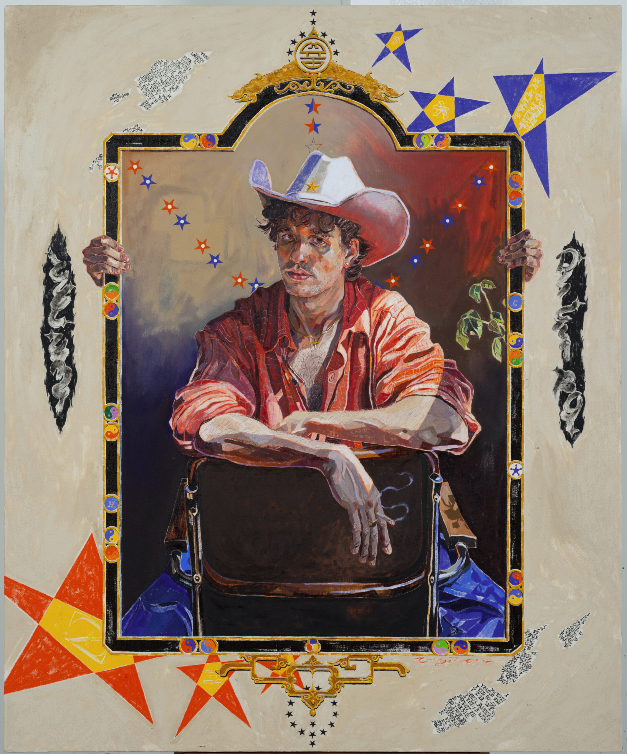 Oscar yi Hou(侯一鳴,1998 年生於利物浦)是一位英籍華裔藝術家,現居於紐約。他的作品融合東西方文化元素,除了代表西方的五芒星、街頭塗雅,還包括源自東方的太極、八卦、仙鶴等圖騰。Oscar 以鮮明的色彩和充滿活力的筆觸,描繪自己在異地文化環境中成長的體驗。他擅長運用繪畫作為媒介探索身份認同、酷兒文化等議題。他的作品曾在紐約、倫敦等地展出,受到策展人的關注和認同。