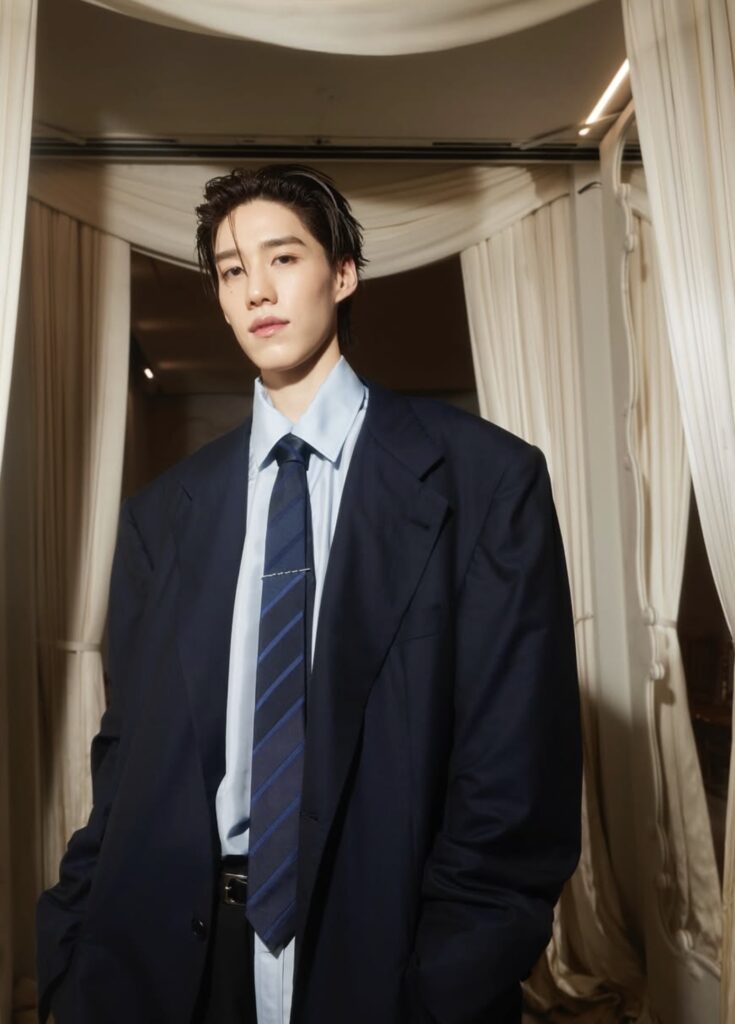 除了青色,他也試過其他顏色造型,例如紅藍色間條 polo shirt ,或者紮個麻花辮,將藍色襯衫放進內搭,外加啡色 jacket 的俏皮 Miu Miu 造型,營造少女感。