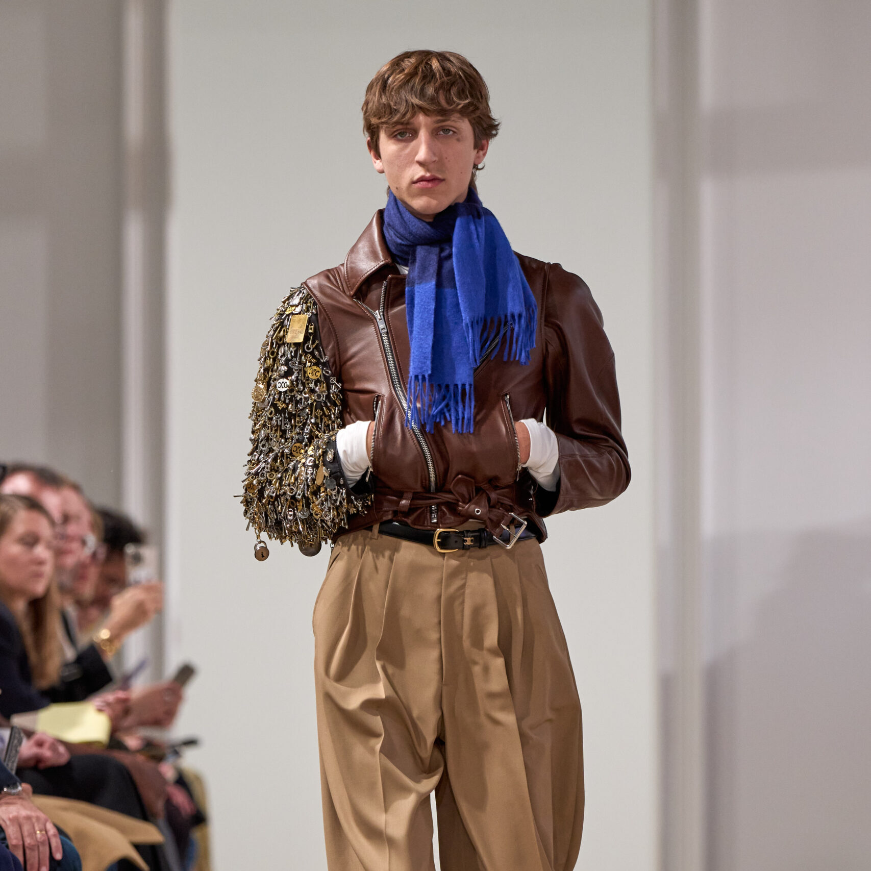 整場 CELINE 2026 春季時裝騷,Michael Rider 毫無疑問地傳承了 Phoebe Philo 與 Hedi Slimane 的美學基因。在外觀,上闆下窄的輪廓設定散發 Hedi Slimane 的「病態美學」;素材上卻移植皮革、絲綢、絨布,進一步揉合 Phoebe Philo 的「Philo-sophy」概念。除此之外,不少單品款式中,也可發現注入了 Polo Ralph Lauren 不少 Ivy League 元素,例如禮服、西裝外套、恤衫、針織冷衫、軍服與牛仔褲,搭載奢華金色項鍊、手飾,以及色彩斑斕的巨大 Tote Bag,延續品牌法式高級氣派之餘,亦貫徹巴黎男、女生向來的瀟灑不羈感,將 CELINE 昇華至另一境界。