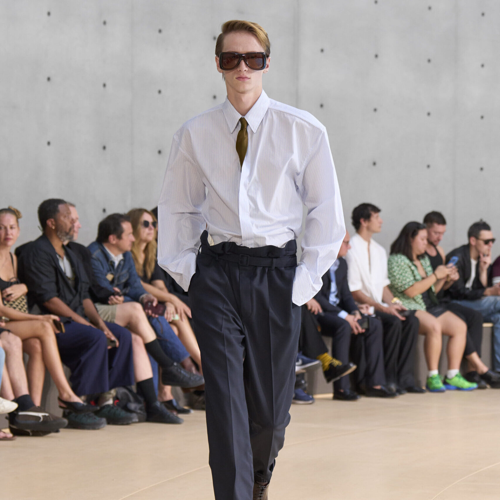 剪裁方面,收腰設計搭配寬肩線條,平衡了經典與現代感,就如以往的系列般讓品牌基因一目了然。在材質運用上,整個春夏系列以絲綢、尼龍等輕盈面料串聯在一起,勾勒出身體線條之餘,亦展現男性的陽剛之氣,使服裝在保持優雅的同時,也具備型格與靈動的美態。色彩成為亮點,光暗上也稍作調節,更貼合品牌沉著的設計美學。沙色、鹽白、淡赭色、及枯苔綠等色調,不會過度張揚,低調內斂地散發迷人氣質。另外,造型上也花了些小心思,例如領呔被塞進了恤衫中,或者隨性地綁上腰帶,在正裝上增添一點玩味。