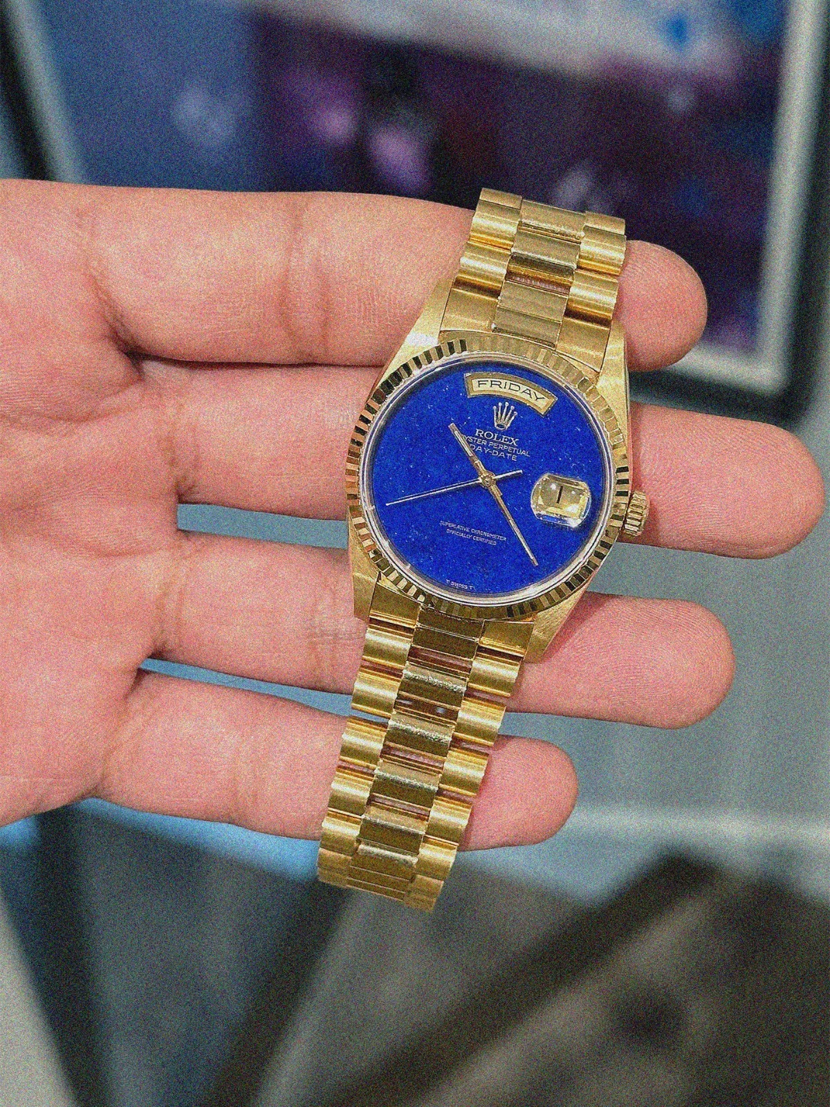 「我一直都很鍾情於 80、90 年代的 Rolex 設計美學,那時候品牌確實創作了很多實驗性的驚人作品,就如這款 1991 年誕生的青金石(Lapis Lazuli)和藍寶石(Sapphire) Day-Date 更是這時期的傑作之一。不僅因為引人注目的藍面錶盤搭配金色外殼與錶帶,還因為它的極佳狀態、品相,令腕錶變得『可遇不可求』。」